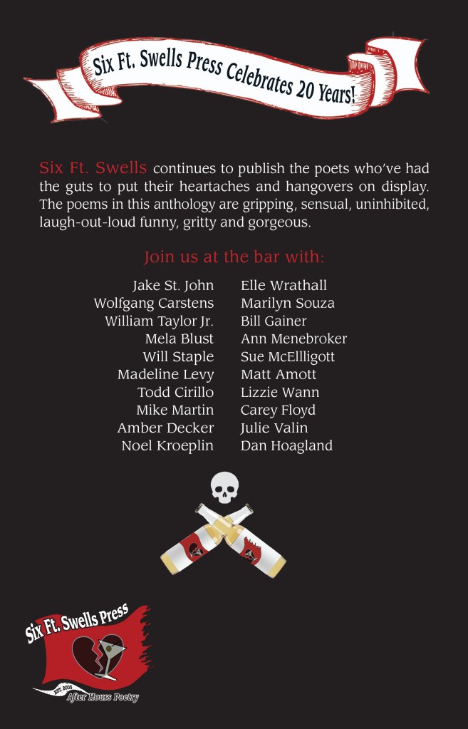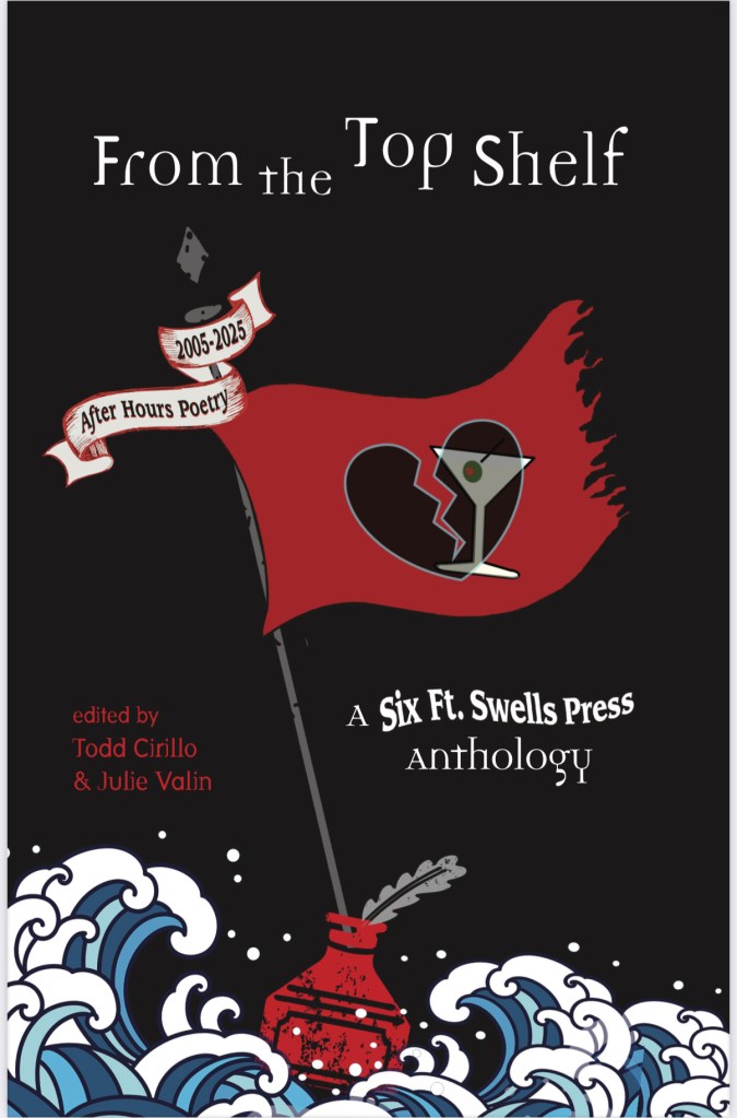 SFS: The anthology: From the Top Shelf: A Six Ft. Swells Anthology 2005-2025 was one of the four celebrations that we produced last year, the others included publishing Jake St. John’s book, The 13th Round, a first-ever book by myself, Julie Valin and Matt Amott: Three Poets Walk Into a Bar and we put together a huge party to launch the books in California.